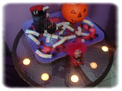 Eu cheguei do Inglês, depois de exatamente 6:00hrs sem comer, e minha mãe disse que tinha algo em cima da cama para mim. Não, eu não pensei em mquiagem, eu queria era comida! Fica SIX FUCKING HOURS sem comer pra você ver como é bom (e o pior é que eu NÃO comi, fiquei até às 20:00hrs sem comer, uhul, proud). Mas o que me esperava era uma mesa linda, cheia das coisas mais lindas do mundo e muito Halloween, e só meu! *-*